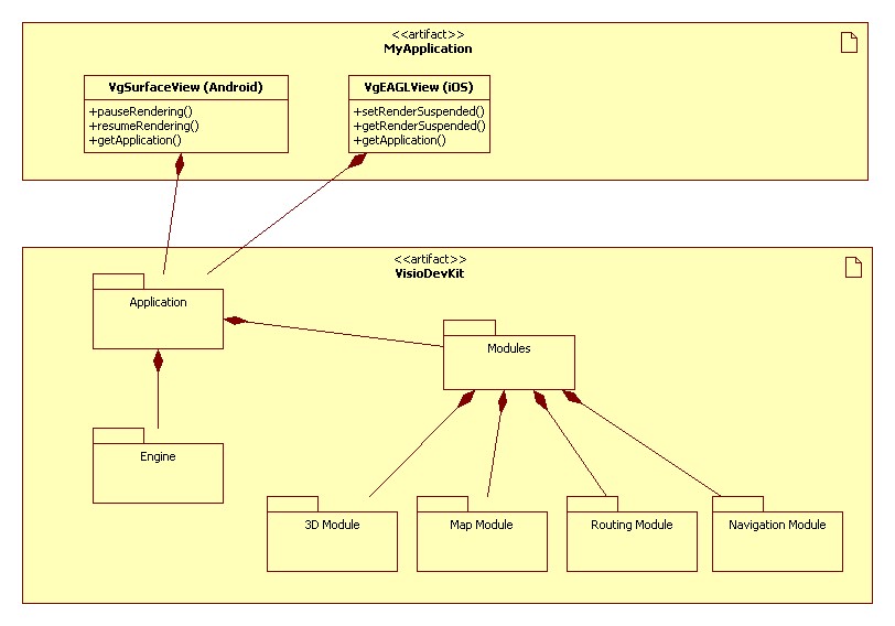 The below dialgram shows an overview of how an application (Android, iOS) might gain access into the VisioDevKit.